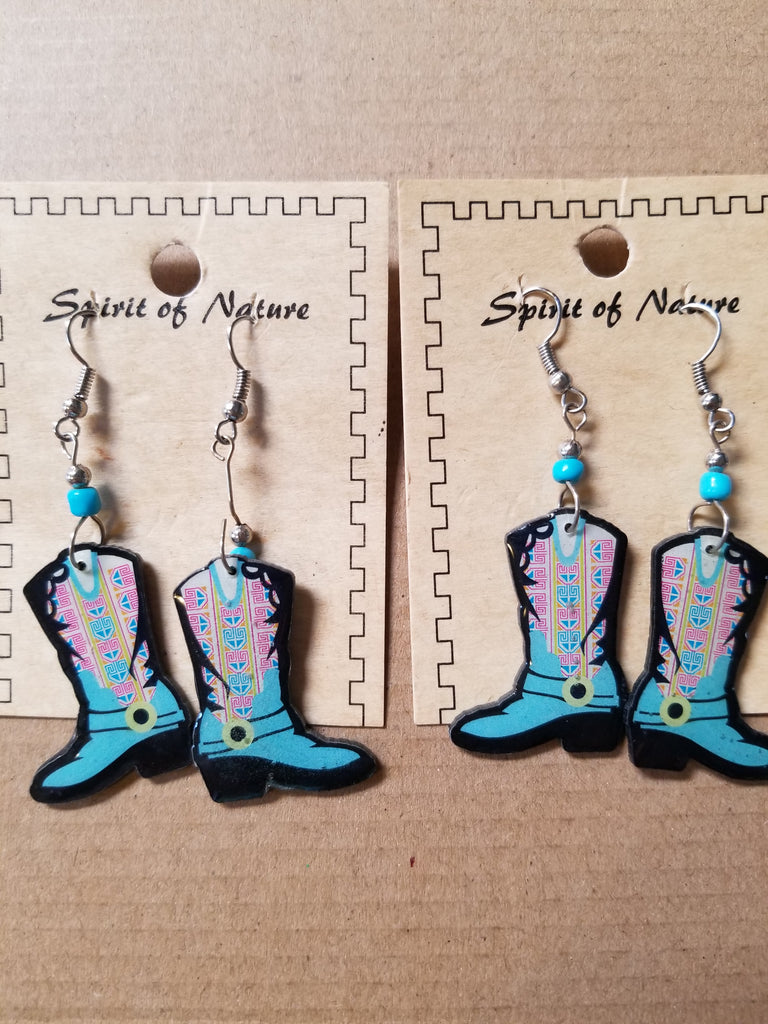 The Boot's base is light blue with a bit of yellow and dark pink in the design. It was hand painted by a local group of Native Americans. We can't use their name because it is Trademarked. The earrings are made from a local stone, carved, polished and then hand painted.